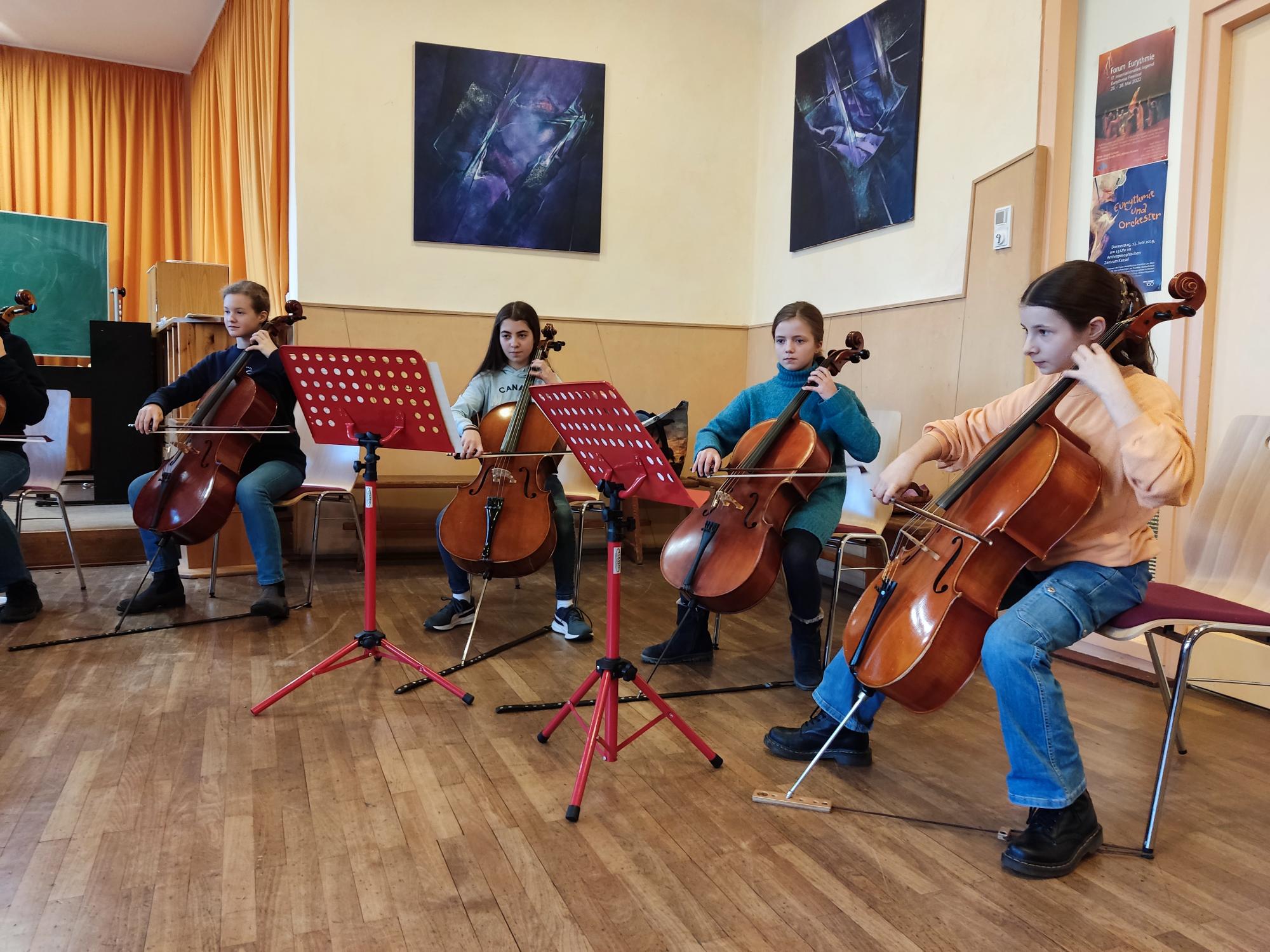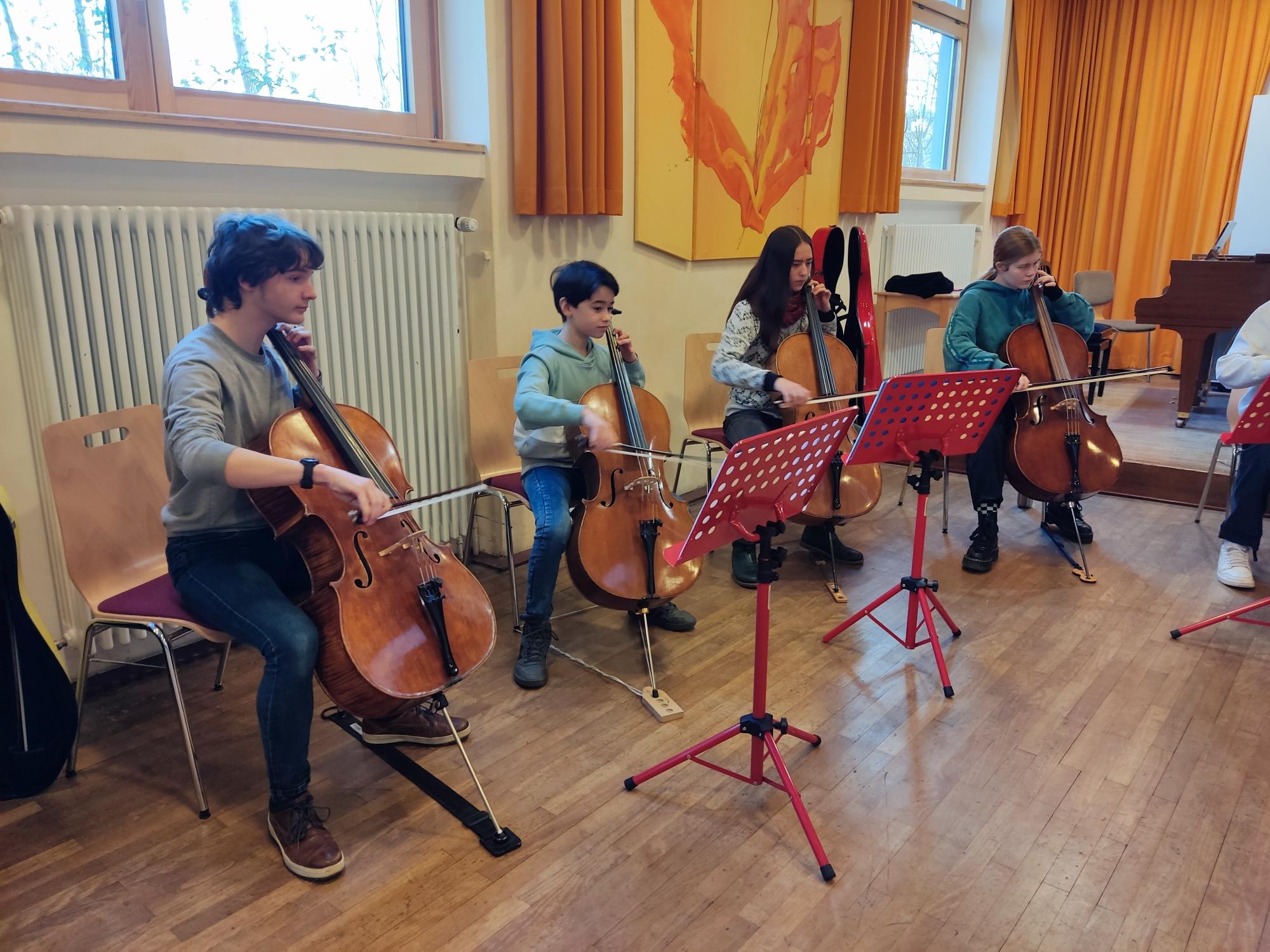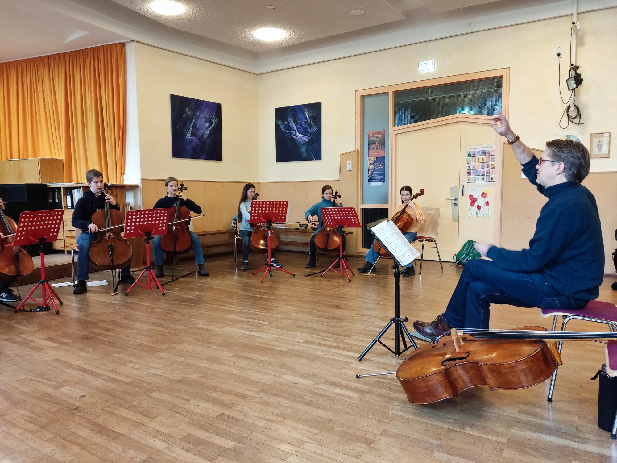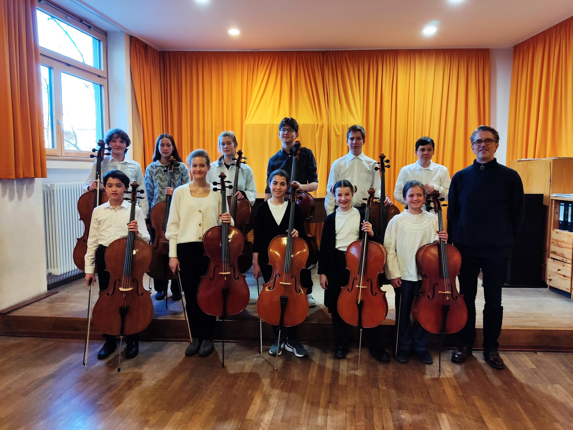 Vom 23. – 26.2.2023 konnten 11 junge Cellisten bei dem Dozenten Stefan Welsch aus Montabaur (Musikgymnasium) ihr Können verfeinern. Die Waldorfschule Kassel stellte uns dafür Räume zur Verfügung. Mit dabei waren auch ein Duo und ein Trio, die schon bei Jugend Musiziert sehr erfolgreich waren und sich hier noch einmal steigerten. Besonders viel Spaß machte wieder das Zusammenspiel im Celloensemble aller Teilnehmer. Beim Abschlusskonzert am Sonntag, 26.2. konnte sich ein zahlreich erschienenes Publikum an den beachtlichen Solo-, Kammermusik- und Ensembledarbietungen erfreuen.